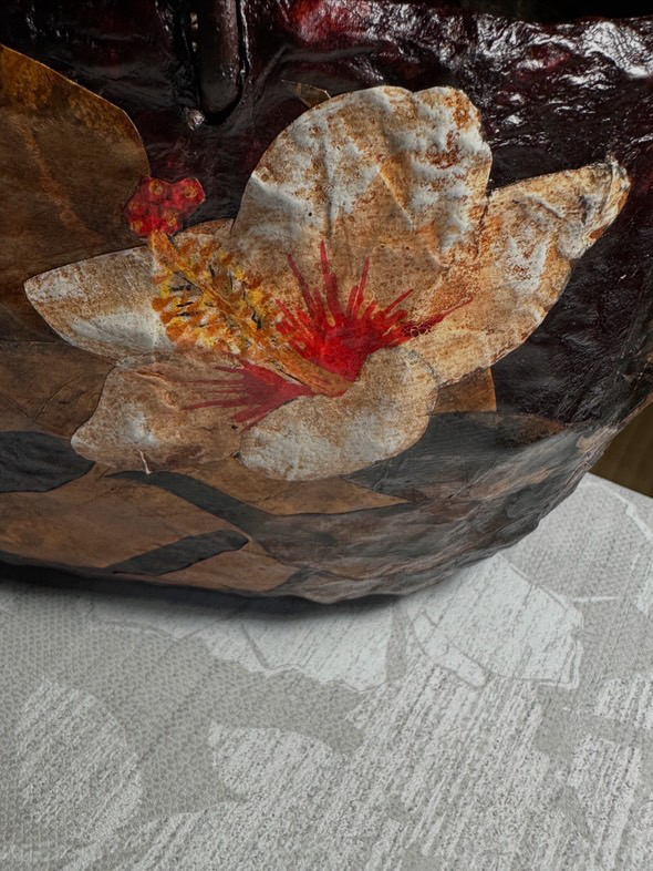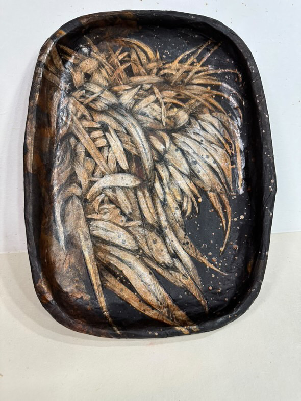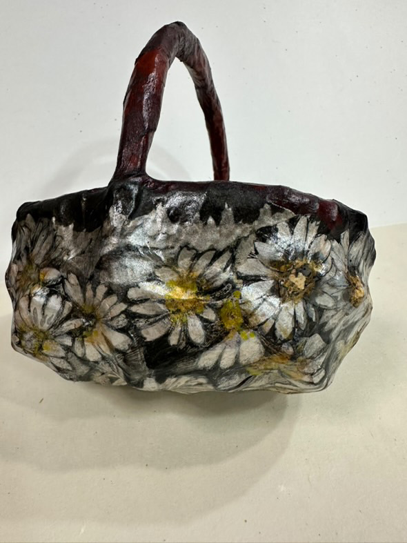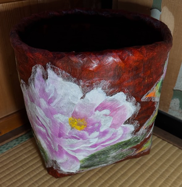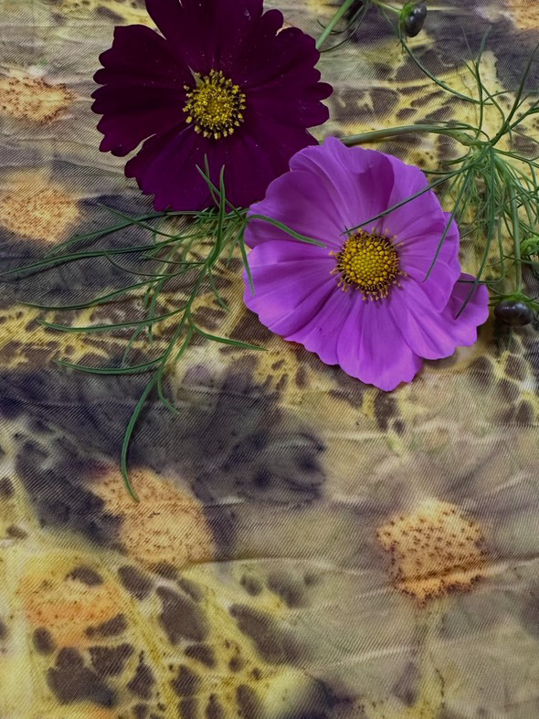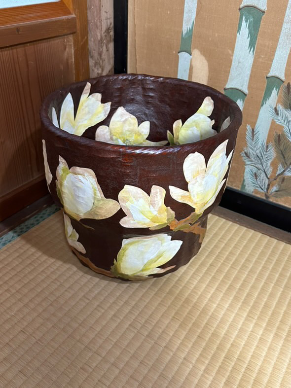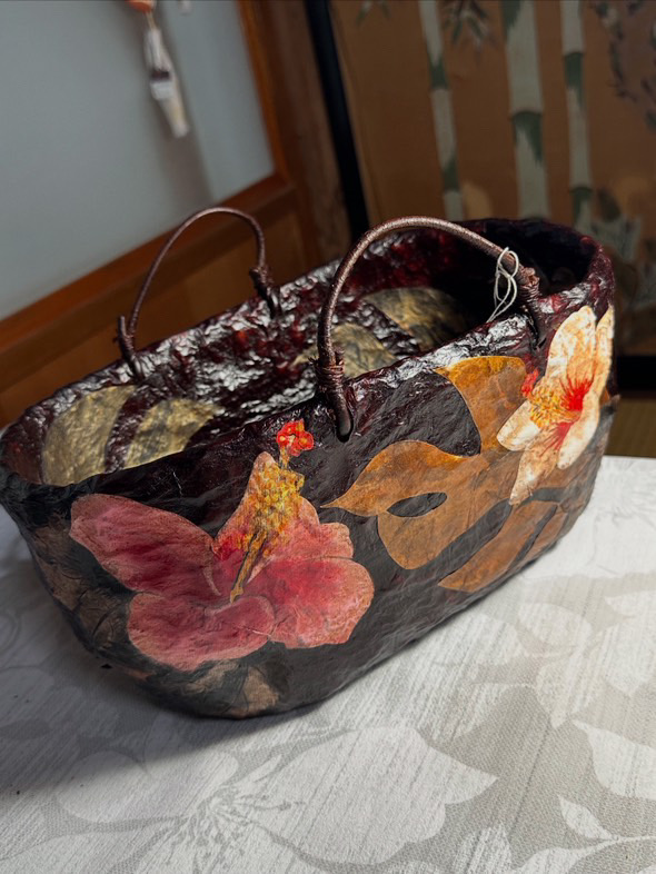 水墨画、染色などの技術を活かして、渋彩というネーミングで柿渋を使ったバッグ、小物入れ、パネルなどと。八ヶ岳ボタニエのネーミングで里山の植物だけで染めた里山色のシルクスカーフなど自然の材料を使ってクラフトを楽しんでます。